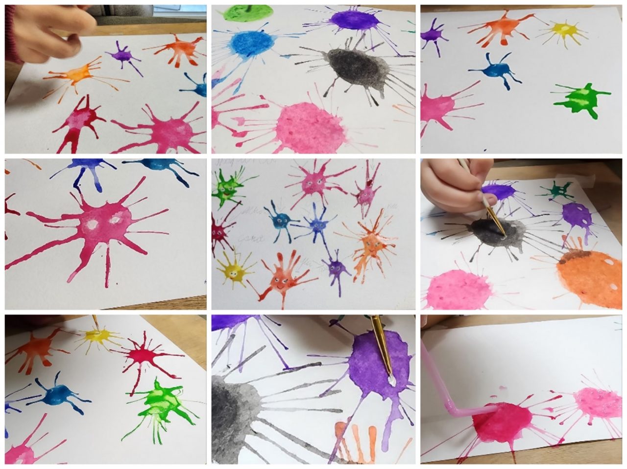 Мы отправились в воображаемую лабораторию и создали собственных«нестрашных вирусов»! Юные ученые-художники капали на лист бумаги жидкой акварелью, а затем с помощью трубочки с усердием и фантазией «раздували» разноцветные кляксы, чтобы у вирусов выросли длинные, причудливые ножки-отростки. После этого мы дорисовали им смешные рожицы.